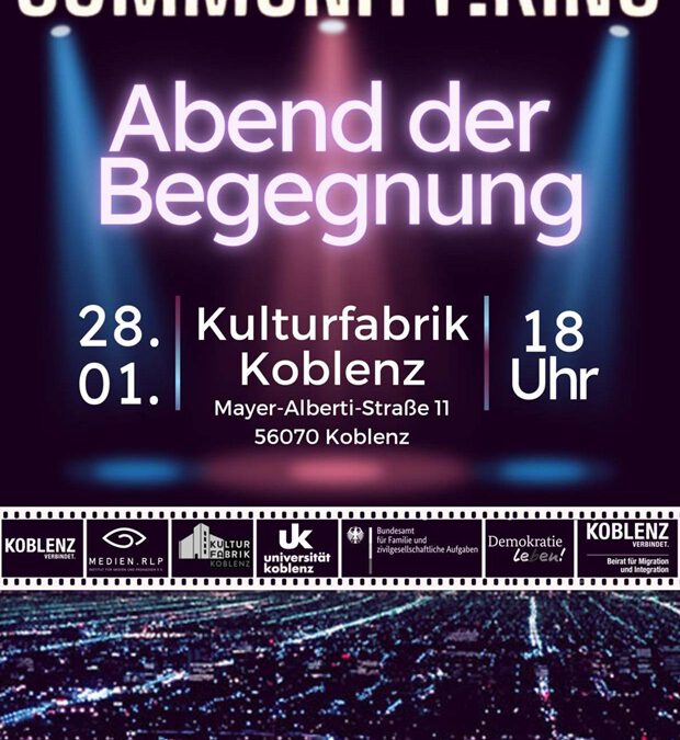 Wir möchten Sie ausblickend auf das Jahr 2025 zum Abend der Begegnung einladen und Ihnen damit einen Vorgeschmack auf ein wundervolles community:kino Programm 2025 geben. Der Abend findet statt am Dienstag, 28. Januar 2025 ab 18.00 Uhr in der Kulturfabrik, Mayer-Alberti-Straße 11 in 56070 Koblenz. Wir würden uns freuen, wenn Sie, Ihre Angehörigen und die Mitglieder Ihrer Community und gerne auch weitere Gäste in der Kufa zusammenkommen beim Auftakt des community.kinos 2025. Wir werden an diesem Abend einen Kulturen übergreifenden Film zeigen. Natürlich gehören auch ein paar Snacks, Getränke und ein kulturtypisches Buffet zu unserem Abend.